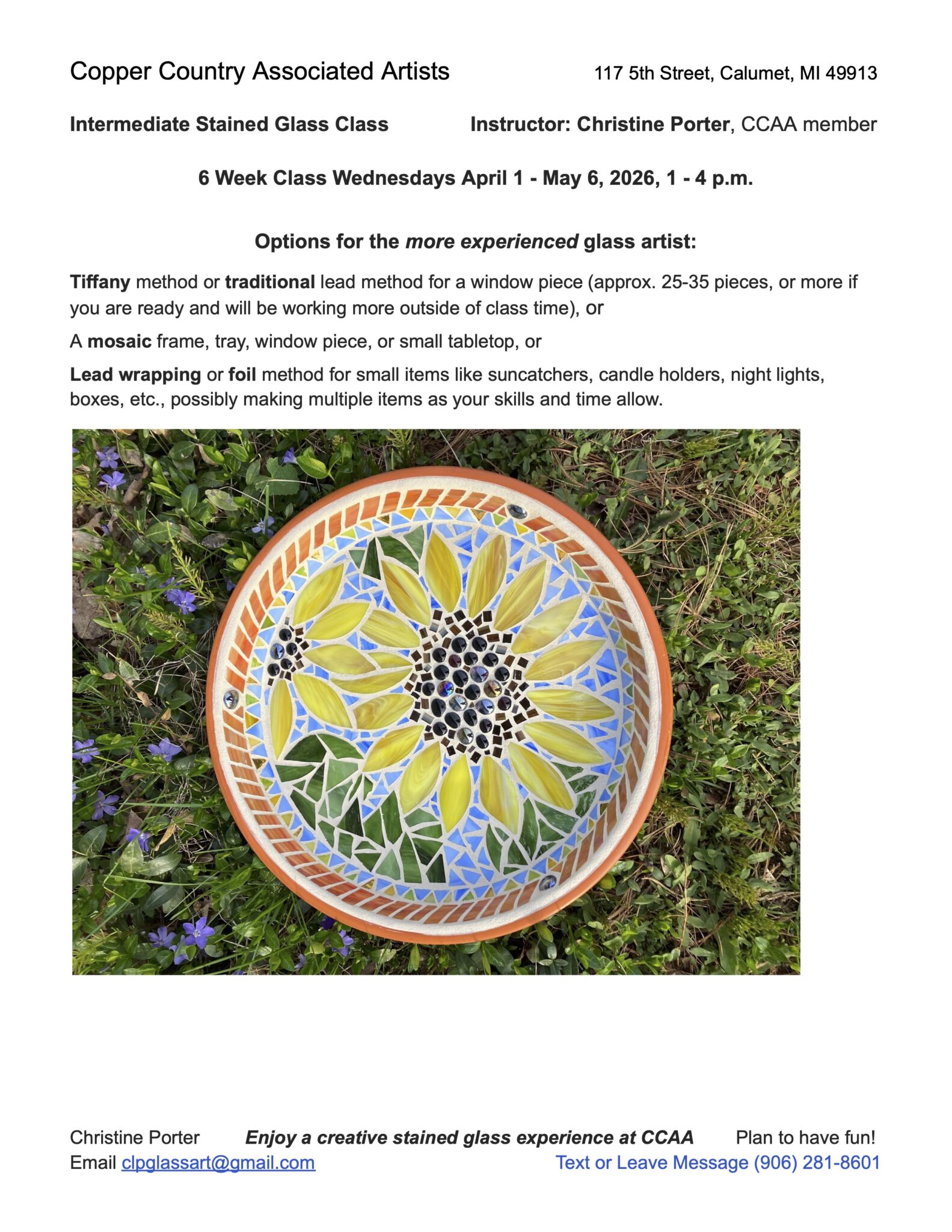 | Tiffany Style Stained Glass | Christine Porter | Feb 11, Wednesday | 1:00 PM | 4:00 PM |