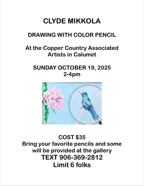 Clyde Mikkola is presenting another of his popular classes. This class will held at the CCAA Gallery at 117 Fifth St. in Calumet.