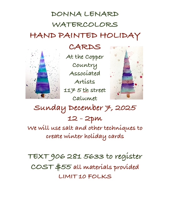 Just in time for the holidays, Donna Lenard is offering this innovative class to show you how to make unique Holiday Cards! Join Donna on Sunday, December 7th from 12 - 2pm at the Copper Country Associated Artists Gallery in Calumet. All supplies are included in your $55 class fee. Save your spot by texting 906-281-5633 now! Don't delay, the class is limited to only 10 folks.